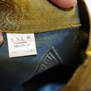 This elegant Vintage XL two-piece set is crafted from muted green 100% silk. The sleeveless top features a high collar and traditional frog closures, offering a sophisticated cheongsam-inspired silhouette. The coordinating wrap skirt has an unconventional layered design, adding unique charm to the ensemble. Perfect for special occasions, cultural events, or as a statement Qipao-inspired look. The luxurious silk brings timeless vintage sophistication to any wardrobe.