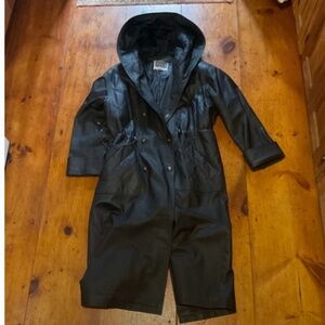 See photos for details. The photos do not do this trench coat justice it really is in great condition for a vintage leather and color is true black.