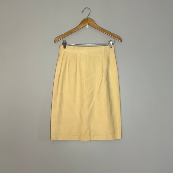 Lovely vintage pencil skirt in a yellowy-beige 100% linen. Features a back vent with darting around the hips and waist. With a rear zipper and hidden tab closure. Fully lined. In excellent vintage condition!
