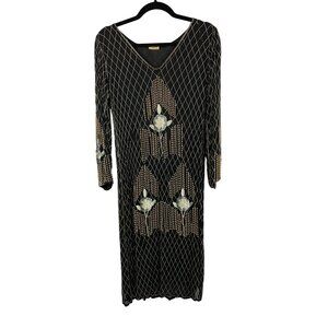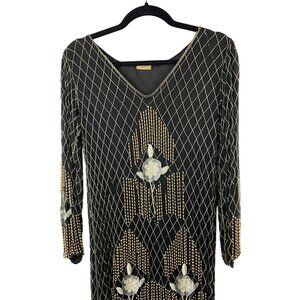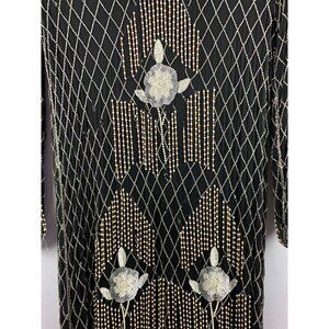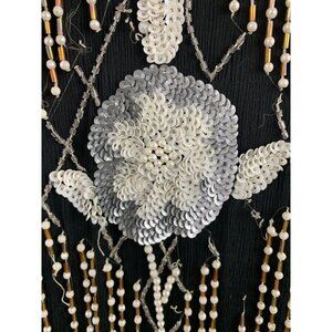 This vintage dress offers a luxurious feel with its pure silk fabric, enhanced by intricate beading. The eye-catching floral design adds an exquisite touch, making it an elegant choice for any special event. The rayon lining ensures comfort, while the V-neck silhouette flatters various body shapes.