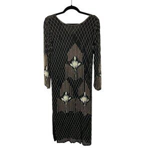 This vintage dress offers a luxurious feel with its pure silk fabric, enhanced by intricate beading. The eye-catching floral design adds an exquisite touch, making it an elegant choice for any special event. The rayon lining ensures comfort, while the V-neck silhouette flatters various body shapes.