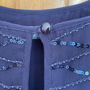 This is an elegant, classic, 100% silk sleeveless shell from Talbots, for evening or wedding guest wear. It is adorned with beads and small sequins, and is fully lined with a silky, breathable polyester fabric. The back has a button closure at the top (pic 4). Accurate color in pic 6.