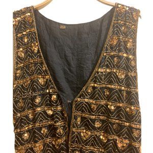 Vintage 100% Silk Black & Gold Sequin Vest | Handmade Embellished Boho Waistcoat