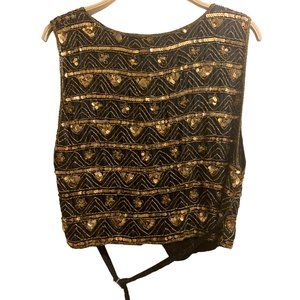 Turn heads with this stunning vintage pure silk sequin vest. A true statement piece that blends artistry and timeless style. Crafted from 100% silk with intricate gold sequin and bead embroidery, this sleeveless vest features a belted back detail for a flattering, adjustable fit.