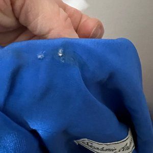 Gorgeous vintage 100% silk double-breasted blazer from Stephanie Andrews in a brilliant blue. Features six button front closure (buttons are fabric covered) with interior button, and three pockets on the front. Very little padding in the shoulders. Fully lined. Still includes extra buttons. Has the smallest bit of damage on the underside of the collar as shown in the last photo, but is in otherwise great vintage condition!