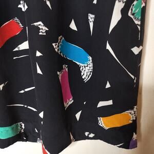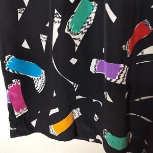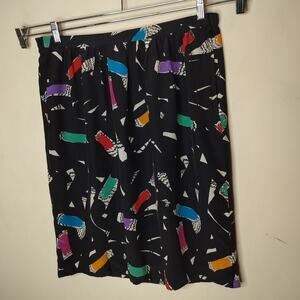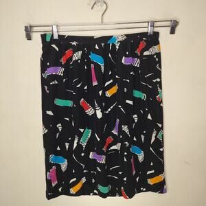Vintage 100% Silk Geometric Print Skirt Black Multicolor Pleated