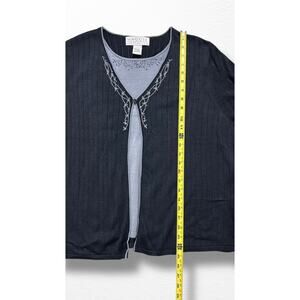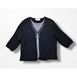 Vintage 1990s layered look sweater from Maggie McNaughton in size 1X. Black cardigan with a sewn-in gray camisole. Beautiful embroidery and beadwork on neckline, edges, and cuffs. Lightweight with a flowy, flattering fit. 100% silk. In flawless pre-owned condition.