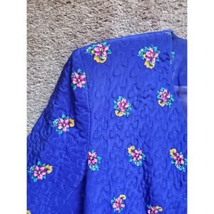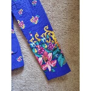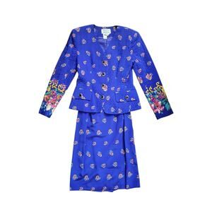Style: Elegant vintage floral silk skirt set. 2 pieces, a quilted blazer and knee-length skirt. Both pieces are 100% Silk. Jacket is a v-neckline with 4-button exaggerated button closure. Shoulder pads. Long, classic sleeves. No stretch. Cut that exaggerates the waistline. Front waist pockets with button closures (still sewn shut). Fully lined. Knee-Length silk skirt with same floral pattern (not quilted). Elastic waist with side zip closure. Pleated waistband. Fully lined skirt with back slit. Dry Clean Only. Made in Korea.