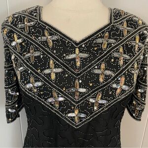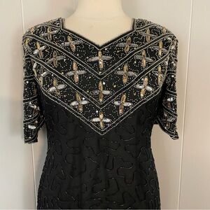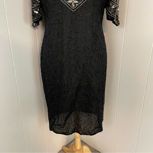 Vintage 100% Silk Sequin Beaded Short Sleeve Jewel Neck Sheath Dress