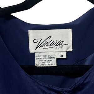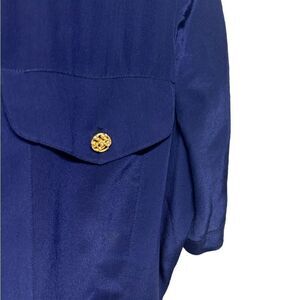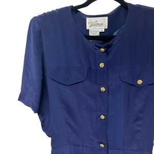 Vintage 100% Silk Victoria Soie Dark Blue Short Sleeve Gold Button Down Dress