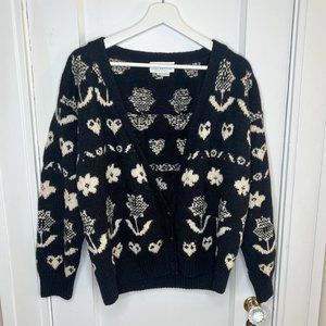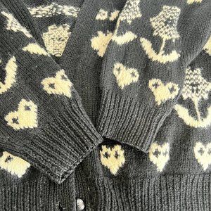 Vintage 100% wool, hand knit, cardigan with heart and flowers print, size L.