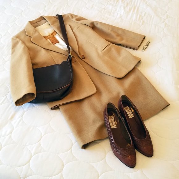Single button blazer with breast pocket, pencil skirt with kick pleat, fully lined; size is shown as 4, but laid flat, the jacket is 19" from armpit to armpit, and the skirt waistband is 13" across.