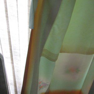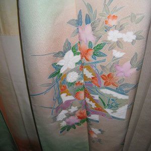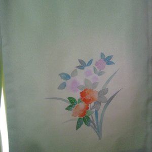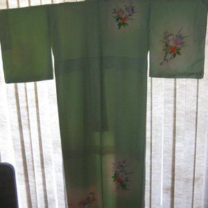 I purchased Japanese antiques from an antique dealer in Kyoto Japan 20 years ago. Now selling my collection. This is a Tomesode, a formal gown. You will need an Obi or belt to wear it in the traditional fashion. Plan a kimono wedding or show up at a formal affair in this gown and watch the eyes pop! It is a beautiful aqua - seafoam green color with floral accents. Kyoto Japan is known worldwide for quality silk kimono. It feels luscious on the skin, with silk lining.There are no tears, stains or worn areas. Measures approximately 24" across at the chest, and 60" long. The sleeves are 16 x 18" (The sleeves are pockets - carry your cell phone in it.) See my other two kimono in my closet.