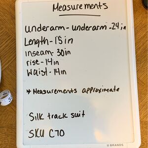 Track suit in great vintage condition. 100% silk. Windbreaker and pants are lined. Pants still have the tag. removable shoulder pads.