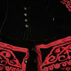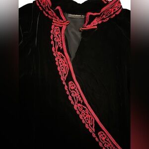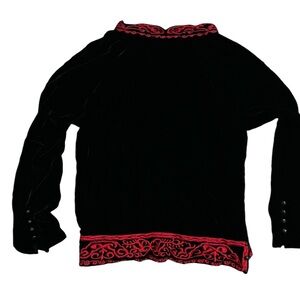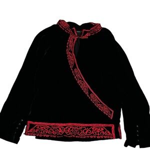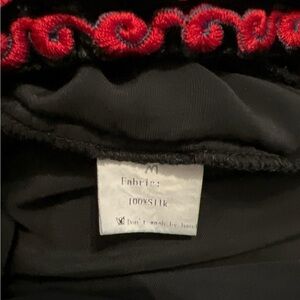 The prettiest silk button up. Red in color with black print & embroidery, opens easily with knotted style closure at neck Luxurious 100% silk fabric