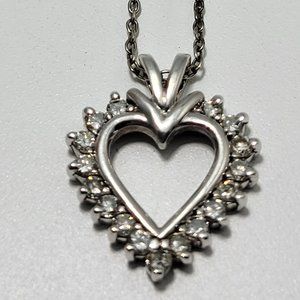 Vintage 10K White Gold 1/3 Carat Total Weight Round Prong Set Sparkling Natural Diamond Heart Shaped Pendant On 15" delicate sterling silver link chain. Diamond pendant weighs 2.6 grams (without sterling chain) and measures 3/4" X 5/8". Perfect Gift for Valentines Day, Anniversary, Mothers Day, Christmas