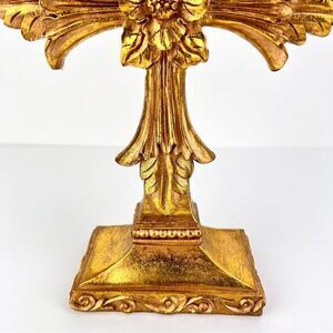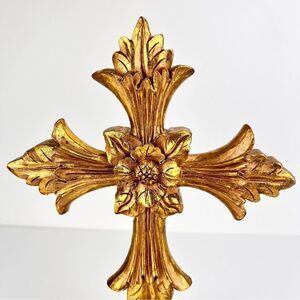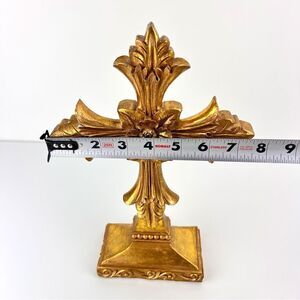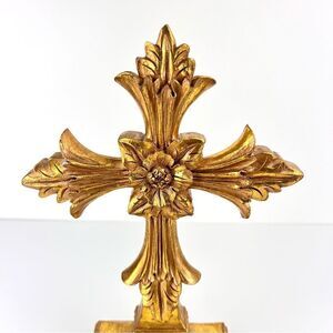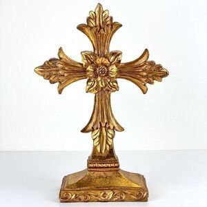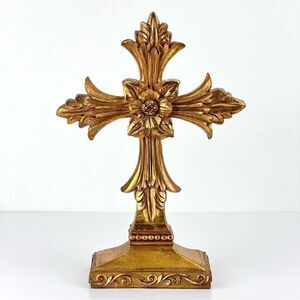 This cross table top is a perfect addition to any religious collection. Measuring 11 inches in height, it features a painted gold exterior with a distressed look that adds a unique touch to its design. Made of high-quality material, not sure of the material used, but it's heavy. this cross is not only beautiful but also durable. It is perfect for display in a church, home, or office. Whether you're a collector of Christian items or simply looking for a unique piece of decor, this cross is a great choice.