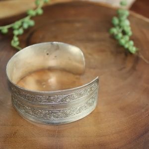 Vintage 1-1/8 Inch Silver Plated Etched Adjustable Cuff. This is from Doe Hart's collection and available through her shop, DoeBee Designs