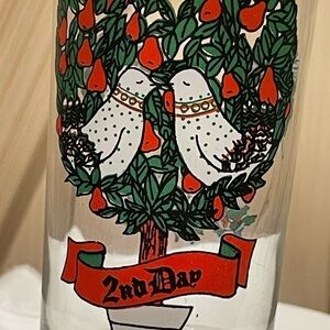 12 days of Christmas glass from Anchor Hocking. 2nd - 2 turtle doves. Good vintage condition. No chips or cracks. 12 oz. Approximately 5.5 inches tall.