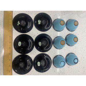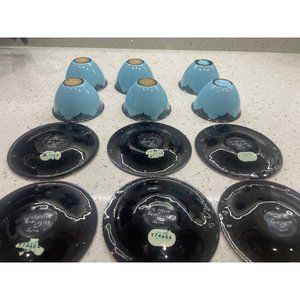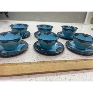 This is a super cool set of 6 cups and saucers made by hand out of glazed enamel on porcelain, signed in Hebrew on back stating made by hand land of Isreal by Haraeli also they are numbered. They are in great condition aside from two of the cups, which have some scratches on the bottom probably from use as they were the only ones used saucers 3 5/8 inches across cups measure 2 5/8 and 5/8 inches by one and a half inches tall.