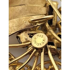 Beautiful vintage MES signed brooch pendant combination, marked 1/20 12K G.F. Features sparkling clear and deep blue rhinestones set in a gold-filled frame with an open circle and fan motif.