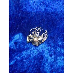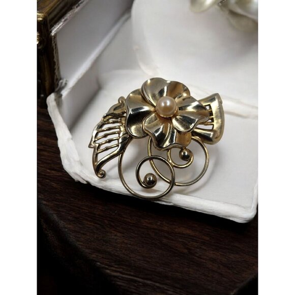 This exquisite vintage brooch features a faux pearl center surrounded by an intricate 12K gold-filled floral scroll design. Versatile as a brooch, pin, or pendant, it adds timeless elegance to any outfit. has some age wear