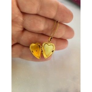 This is a vintage 12k yellow gold filled heart-shaped photo locket pendant necklace.