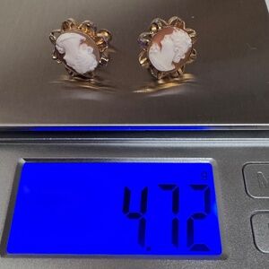 Pre-owned; in good vintage condition. Shows signs of wear. Age appropriate patina & wear remains. A pair of vintage 12K yellow gold filled carved shell cameo earrings with screw-back closures. 1-20 12K G.F. is marked on both screw-backs (see photos #8-9). Each earring measures 1.2"L x 1.2"W inch. The total weight of the earrings is 4.72 grams. Measurement & weight are approximate. A complimentary of a jewelry box is included.