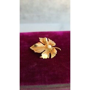 This is a vintage Karen Lynne signed 12K gold filled maple leaf shaped brooch with a faux pearl.