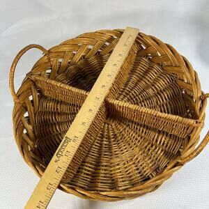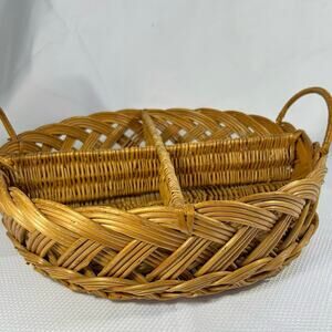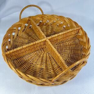 Vintage 13" Round Divided Woven Wicker Tray Basket With Handles Serving Decor