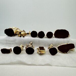 Vintage 13 pc Manger Nativity Set Gold Ceramic Figurines Wood Straw Christmas
