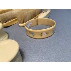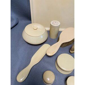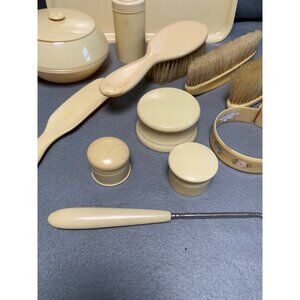 Vintage 13-Piece Ivory Celluloid Vanity Set with Brushes Jars & Tray