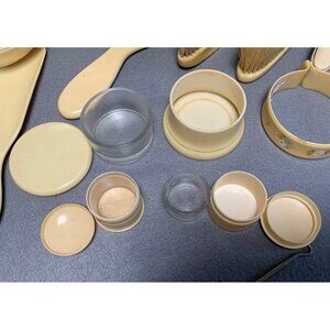This elegant 13-piece vintage vanity set includes various brushes, jars, and a tray. Crafted from ivory-colored materials, it adds a touch of classic sophistication to any dressing table.