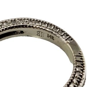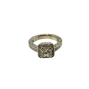 This sparkling ring features one princess cut diamond (1.12 ct.) accented with 85 round brilliant cut diamonds set in beautifully detailed 14K white gold.