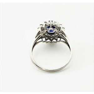 This spectacular ring features one oval cut sapphire (8 mm x 6 mm) and 28 round brilliant cut diamond set in classic 14K white gold. Top of ring measures 15 mm x 14 mm. Shank measures 1.5 mm.
