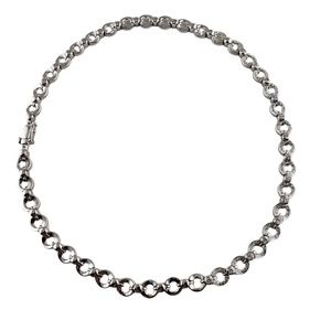 This stunning necklace features old mine and round brilliant cut diamonds set in beautifully detailed 14K white gold. Width: 8 mm.