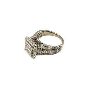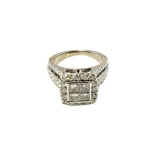 This sparkling ring features four princess cut diamonds and 56 round brilliant cut diamonds set in beautifully detailed 14K white gold. Width: 12 mm. Height: 9 mm. Shank: 2 mm.