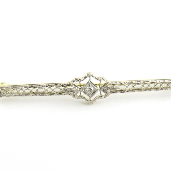 This lovely bar pin features one round brilliant cut diamond set in beautifully detailed 14K white and yellow gold filigree.