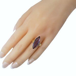 This stunning ring features one simulated amethyst (24 mm x 10 mm) set in beautifully detailed 14K yellow gold. Shank: 2 mm.