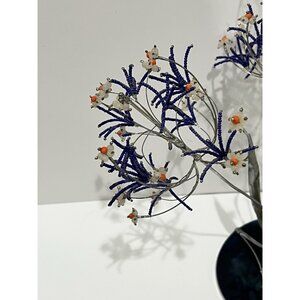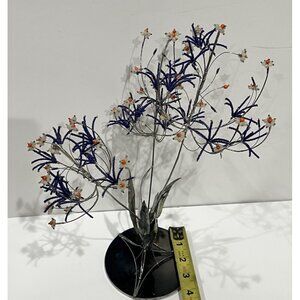 Beautiful handcrafted vintage metal and glass flower sculpture. Features intricate wirework stems with blue and orange beaded glass flowers, mounted on a round stained-glass base.