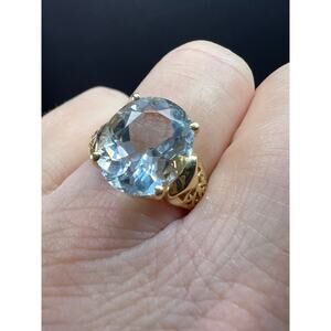 Featuring a striking 9.9mm round-cut aquamarine set in solid 14K yellow gold. The 4.10-gram setting has ornate filigree shoulders and a raised open gallery that lets light pour through the gem, creating beautiful sparkle. Stamped and tested 14k. Unable to read hallmark. Elegant and timeless, this piece makes a beautiful statement or March birthstone gift. Size 7.