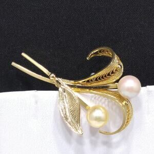 Vintage 14K Gold Filled Floral Spray Brooch with Two Pearls Mid-Century