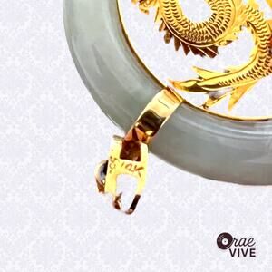 The centerpiece is a smooth, circular frame of genuine Jade. Within this jade ring, the detailed gold dragon is accented with vibrant splashes of color from small, rich red and lush green gemstones. This combination brings the mythical creature to life, making the pendant a true work of art.