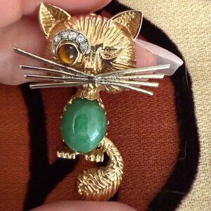 Vintage 14K Gold Winking Cat Brooch with Gemstones