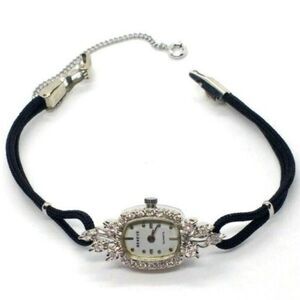 This Listing is for an elegant vintage women's 14K white gold diamond Geneve quartz wristwatch. This beautiful watch has a nice design featuring a sparkly array of diamonds. The watch has a cord band with a gold plated fold-over clasp and a safety chain for additional security. This will fit a 6.5 inch wrist. This would make an excellent gift or addition to one's jewellery collection.