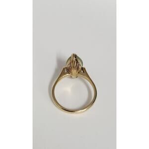 The product is a vintage 14k yellow gold ring featuring a natural jade stone, with a unique size of 5.25. This ring has a nature-themed design and is crafted from high-quality yellow gold, showcasing a beautiful and timeless piece of vintage jewelry.