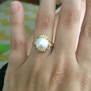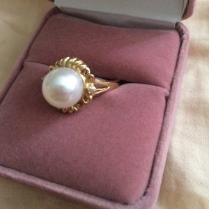 This is a beautiful vintage hand carved diamond and pearl gold ring. It was my engagement ring but my fingers were swollen from my pregnancy so we ended up getting me a new ring😊 2 small diamonds on opposing sides. Stamped 14k gold band with a large freshwater pearl in the center. The band is a rope style surrounding the pearl. Estimated size 6.5 or 7 comes with jewel box I purchased it in from a small boutique in New Orleans.