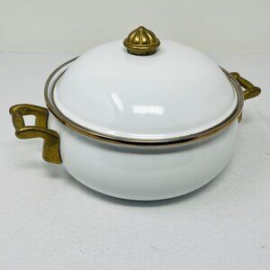 Vintage 1.5qt 6-Cups Bon Chef White Enamelware Pot & Lid w/Brass Handles Serving