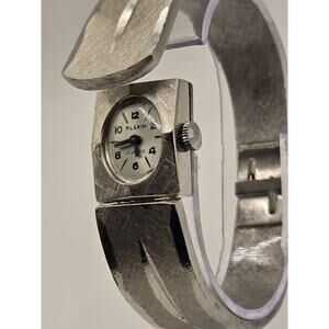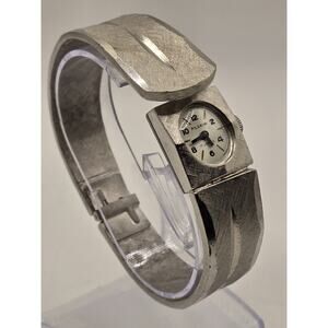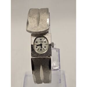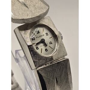 This Vintage 17 Jewels Pilgrim Bracelet Peek A Boo Mechanical Watch is a classic timepiece with a silver bezel, dial, and caseback. The watch features a mechanical (manual) movement with 17 jewels, making it accurate and reliable. The bracelet band is made of metal and matches the color of the case and dial. This dress/formal, casual, and classic style watch is perfect for women and is running great. It does not come with papers, box/packaging, or water resistance features, but it does have a snap caseback and an analog display.