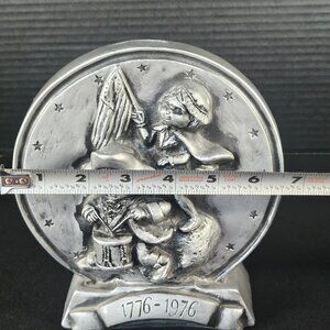 A commemorative Piggy Bank celebrating the U. S Bicentennial. Its. 7 5/8 inches tall and features two children in full celebration drumming and waving the US flag. The back of the bank features a. piece of paper with the declaration. of Independence on it The bank will make an excellent addition to a bicentennial collectors or someone who likes vintage piggy banks. Has a label on the back that reads, Coinbank First National Bank of Wahoo, Nebraska. Manufacturers label is on the bottom that states Royalty Industries Inc, creative vinyl products. Made in USA. In nice vintage condition. measures 7 5/8 inches by 2 1/2 inch. Non smoking pet free home.